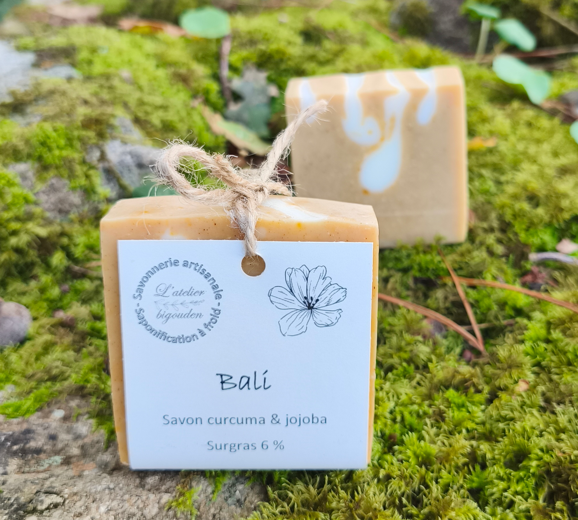 Composition | Huiles bio saponifiées et non saponifiées d’olive, de coco, de tournesol, de jojoba et de rose musquée, glycérine, curcuma, poudre de rocou bio, huile essentielle bio de palmarosa, argile jaune |