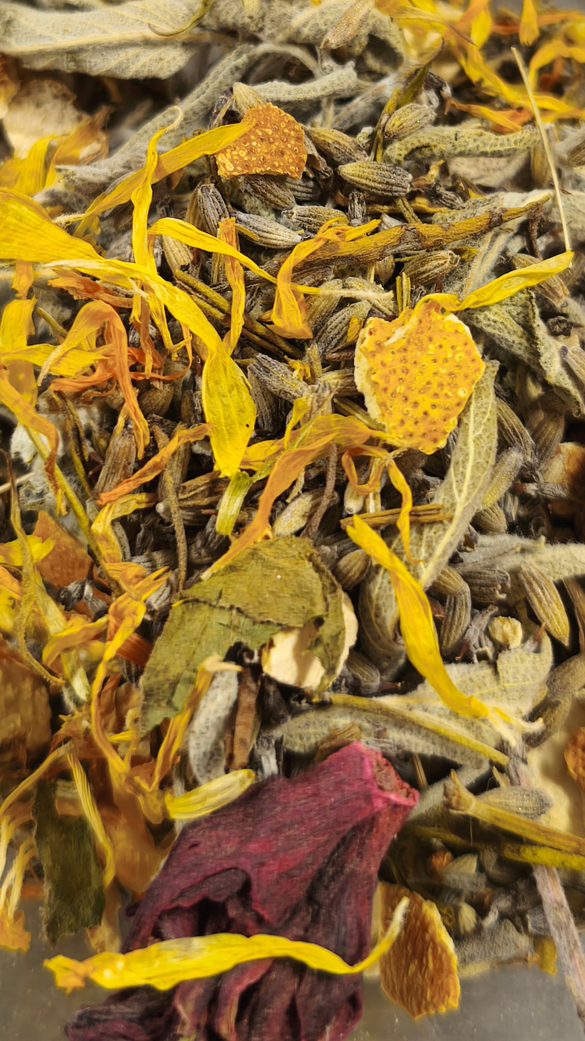 Ingrédients : Salvina Officinalis leaves*, Lavandula Augustifolia flowers*, Calendula officinalis flowers*, Hibiscus Sabdariffa flowers*, Citrus aurantium dulcis peel*
